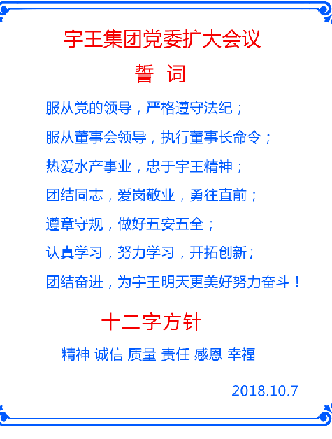 最后,由苗總親擬宇王集團(tuán)黨委誓詞,提出“精神 誠信 質(zhì)量 責(zé)任 感恩 幸福”十二字方針,以此作為宇王集團(tuán)黨員行為標(biāo)準(zhǔn)以及集團(tuán)公司全體職工行為模版。全體與會人員莊重宣誓,此次會議圓滿結(jié)束。